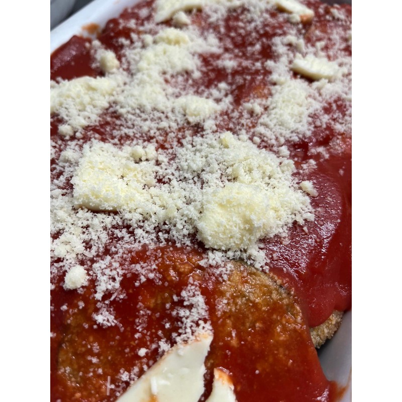 Parmigiana di melanzane: melanzane fritte in forno, olio d'oliva, mozzarella, parmigiano, pangrattato, sale.