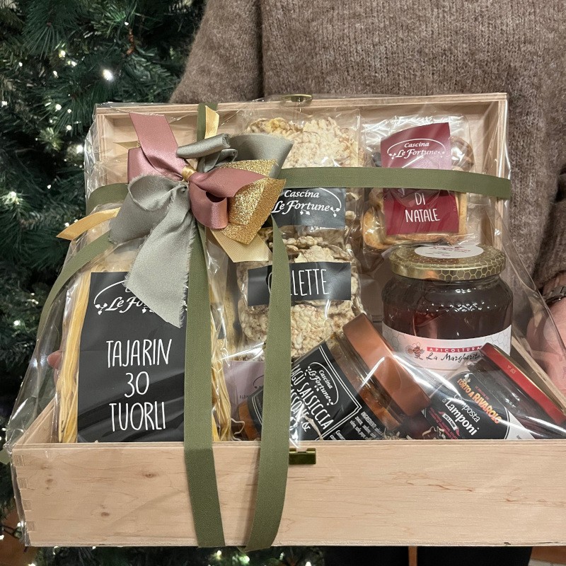 Confezione natalizia con prodotti a vista.
