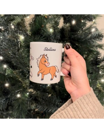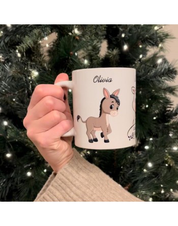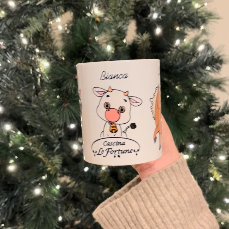 Simpatica tazza da colazione con i nostri amati animaletti: Bianca la vitellina, Oliva L'asinella e Stellina la cavalla.