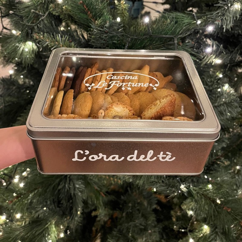 Scatola in latta con finestra trasparente contenente un mix dei nostri frollini di Natale ai gusti: vaniglia e limone, pistacchio, cannella, cacao, gocce di cioccolato, cocco, nocciola, cantucci e nuvole.